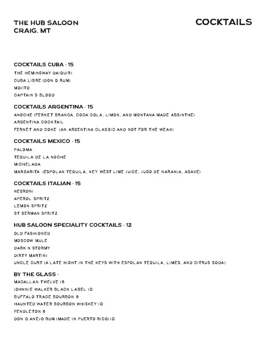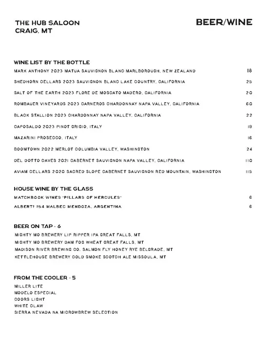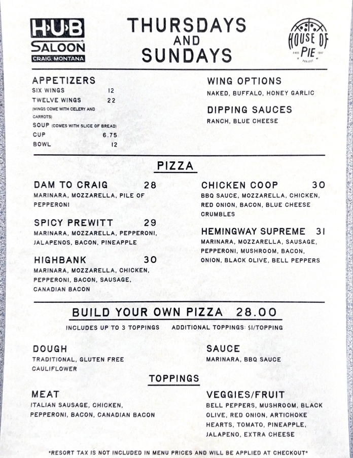 STOP IN, TAKE OUT, CALL IN, WE MAKE PIZZAS IN CRAIG AT THE HUB SALOON.